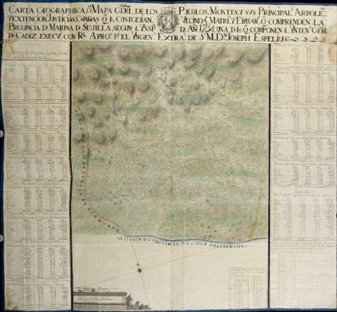 Título: Carta geographica o Mapa gerl. de los pueblos, montes y sus principals. arboleas. y extencions., justicias, guardas q. los custodian, vecindas., matris. y embars. q. comprenden la Provincia de Marina de Sevilla, segun la Ynspon. de año 1754, una de las q. componen la Yntena. Gerl. de Cadiz, execuo. con Rl. Apron. pr. el Yngenro. Extrae. de S.M. Dn. Joseph Espelius